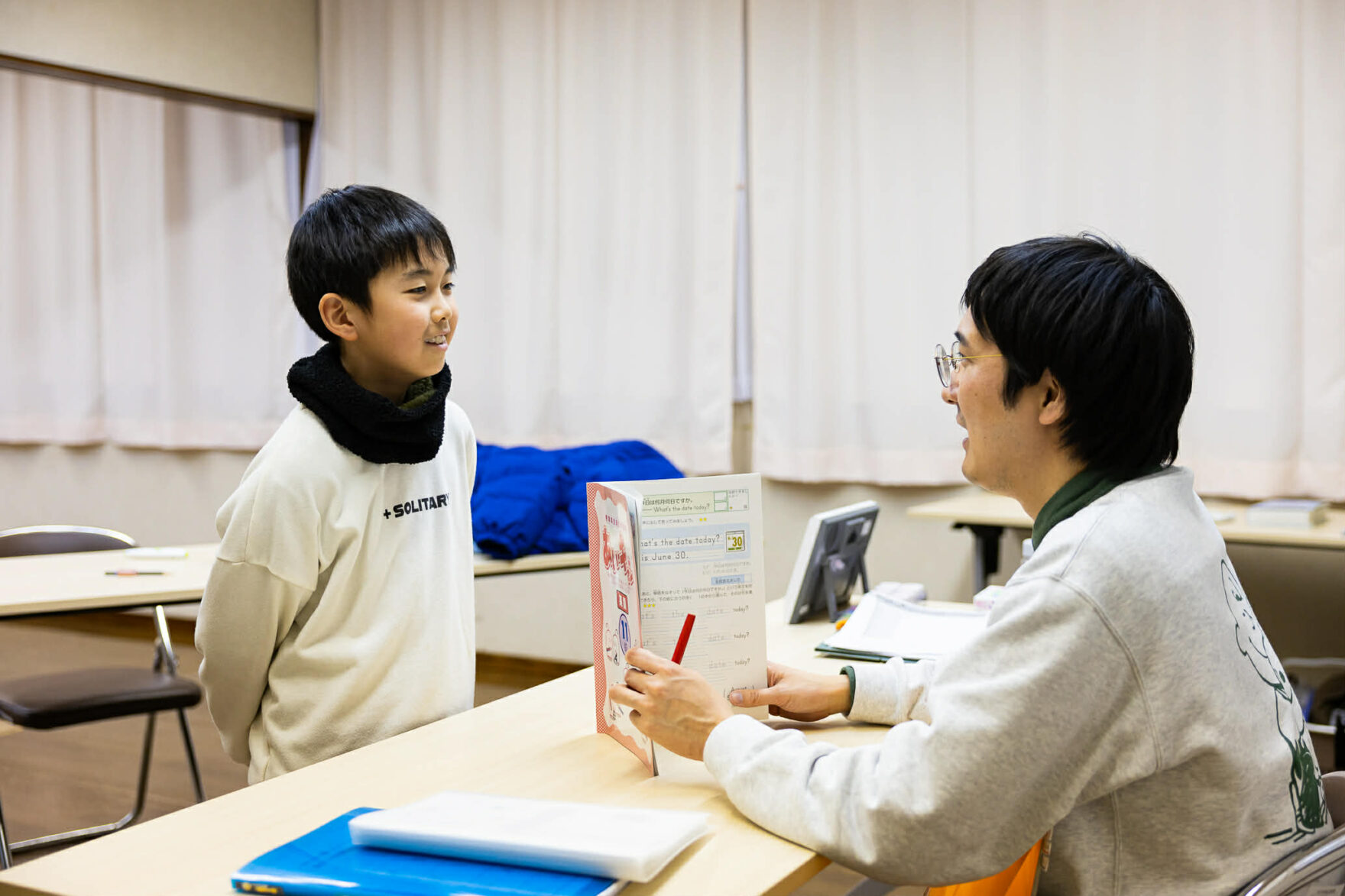 教室では、集団指導と個別指導を組み合わせたハイブリッド型を採用し、あいさつクイズ、単語学習、会話、パズルなど、子どもたちが楽しみながら英語にふれられるコンテンツが充実しています。教室長の小田さんは、「英語でいろいろなことができるように」との思いで教室を運営しているそうです。